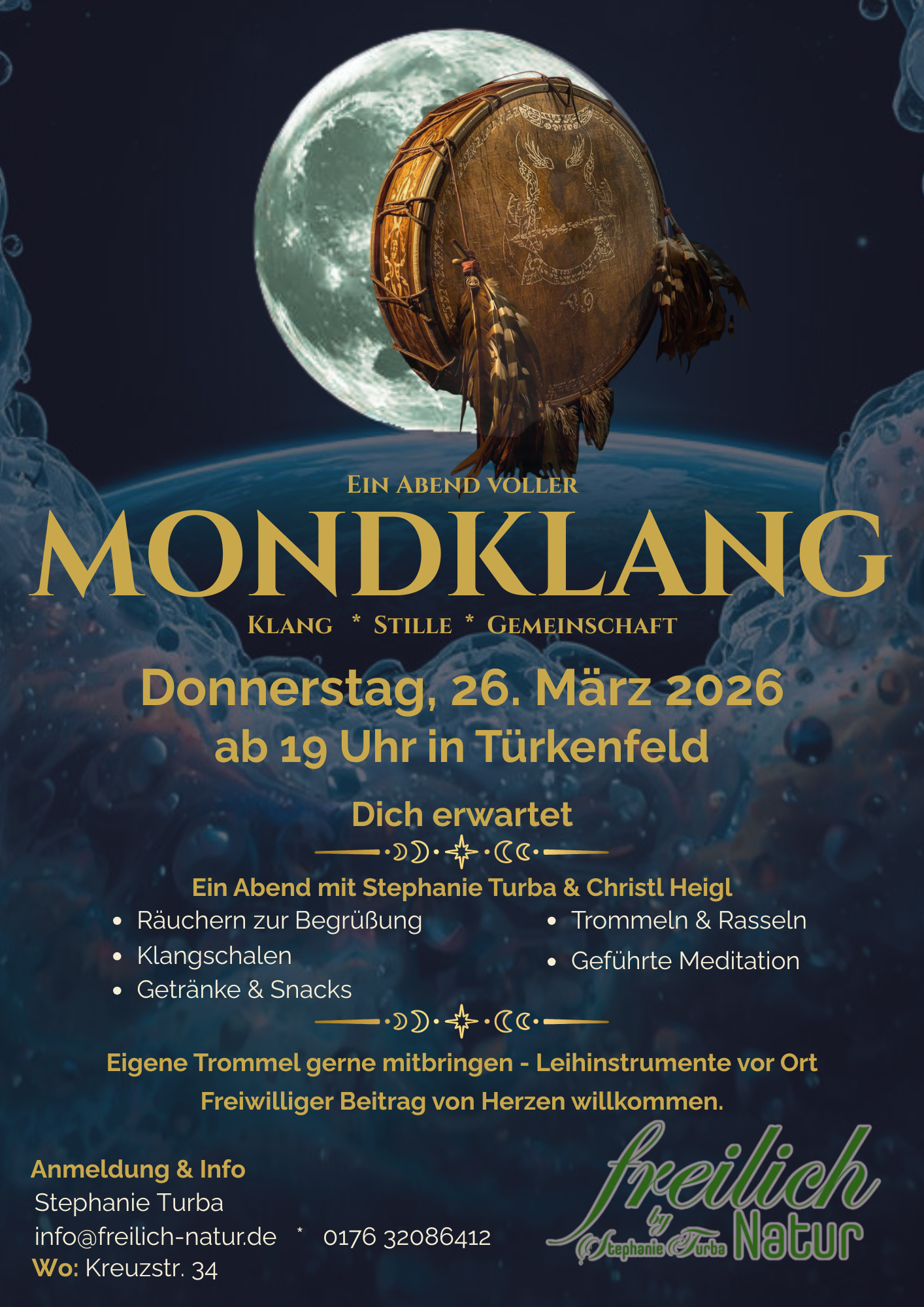 Einmal im Monat kommen wir zusammen – ohne Agenda, ohne Leistungsdruck, einfach um zu sein. Der Mondklang ist ein Abend für deine Seele: Wir trommeln den Alltag aus dem Körper, räuchern den Raum frei, lassen Klangschalen schwingen und finden gemeinsam in die Stille.